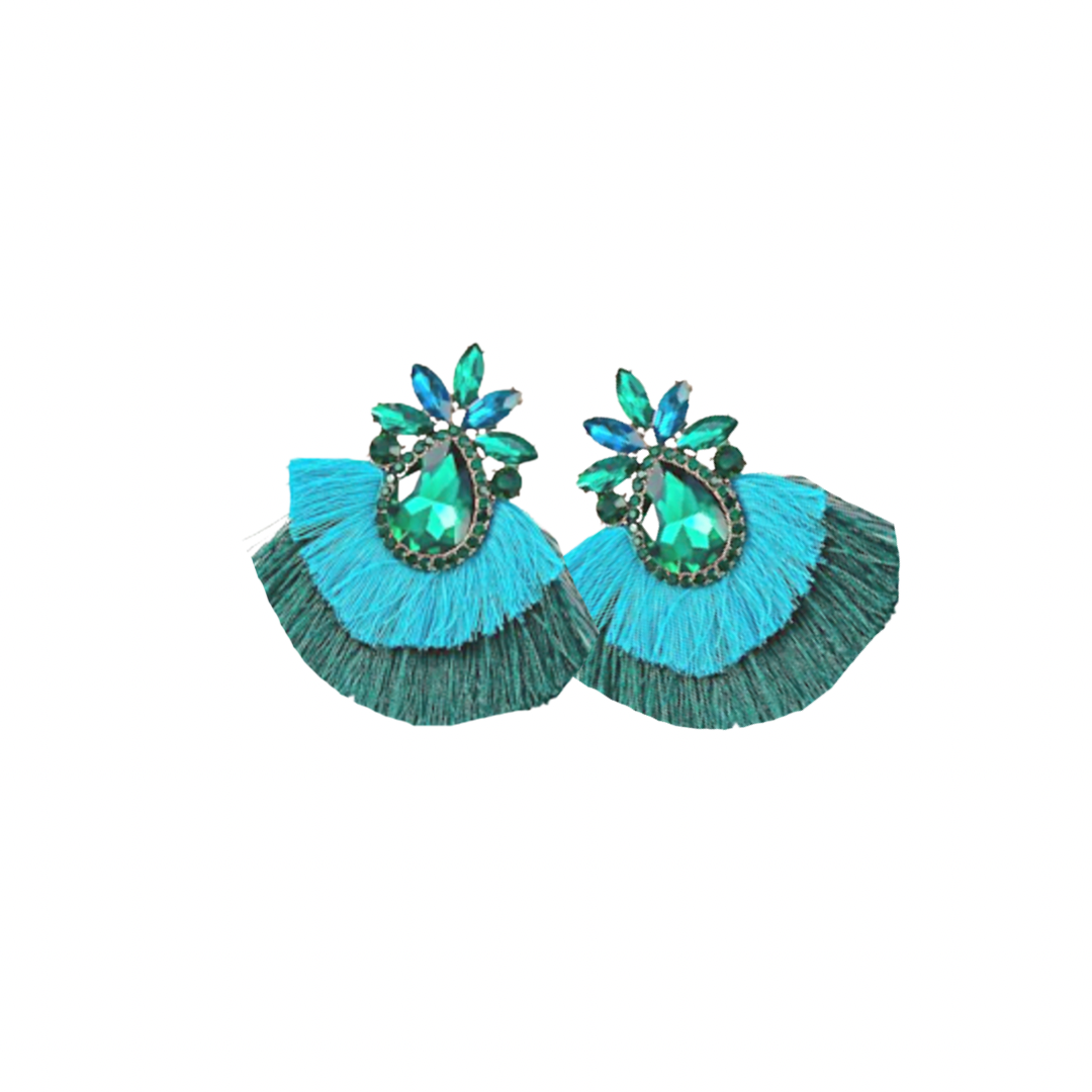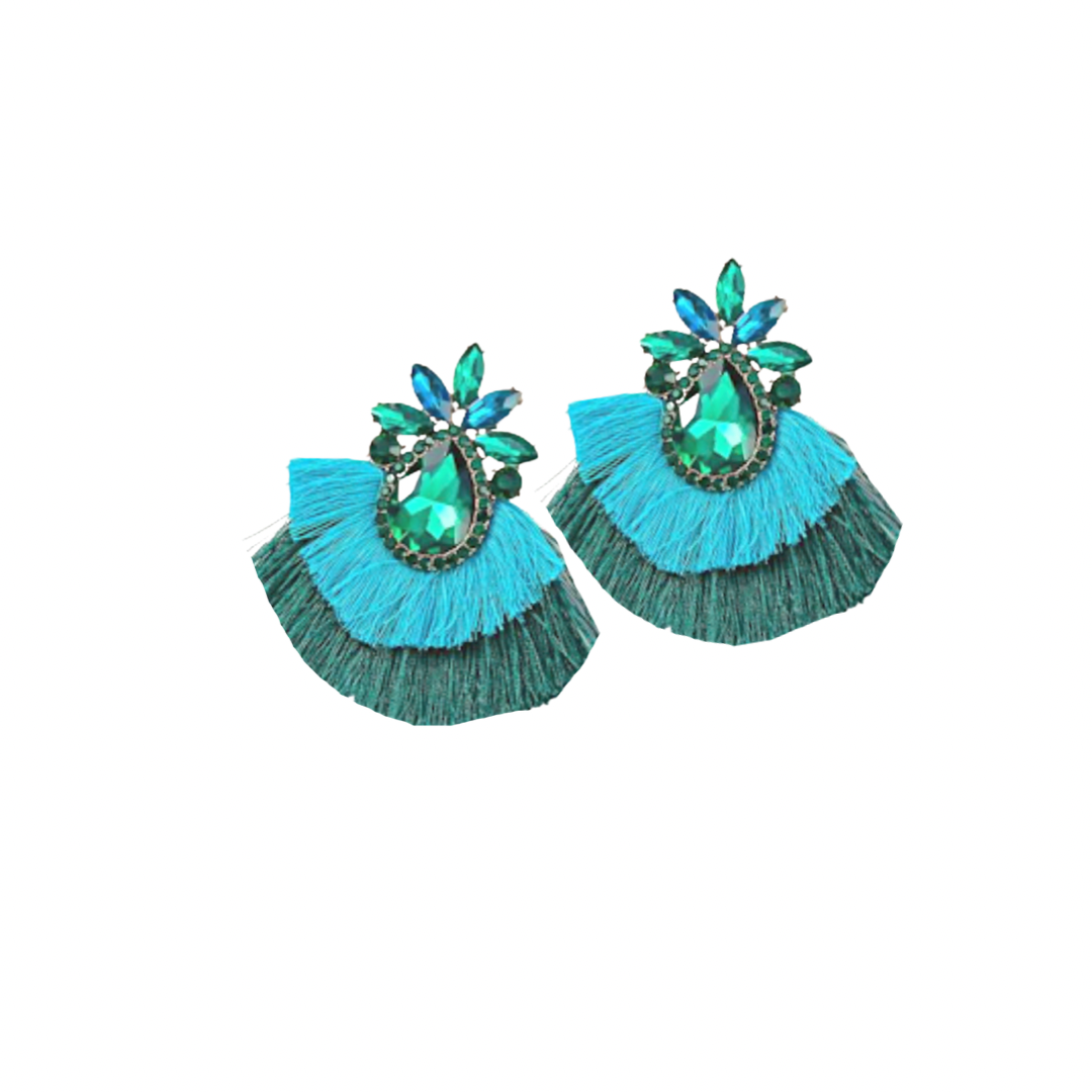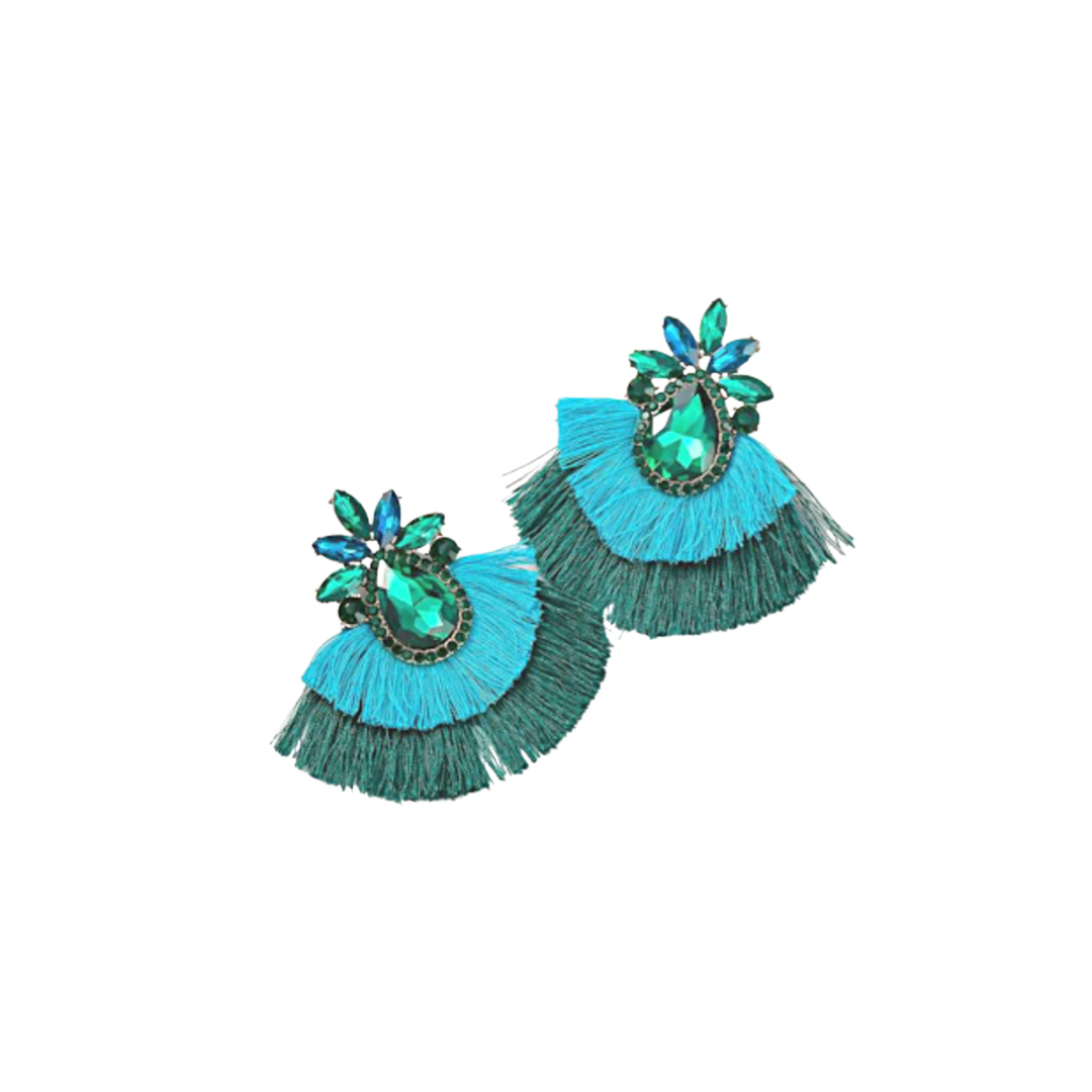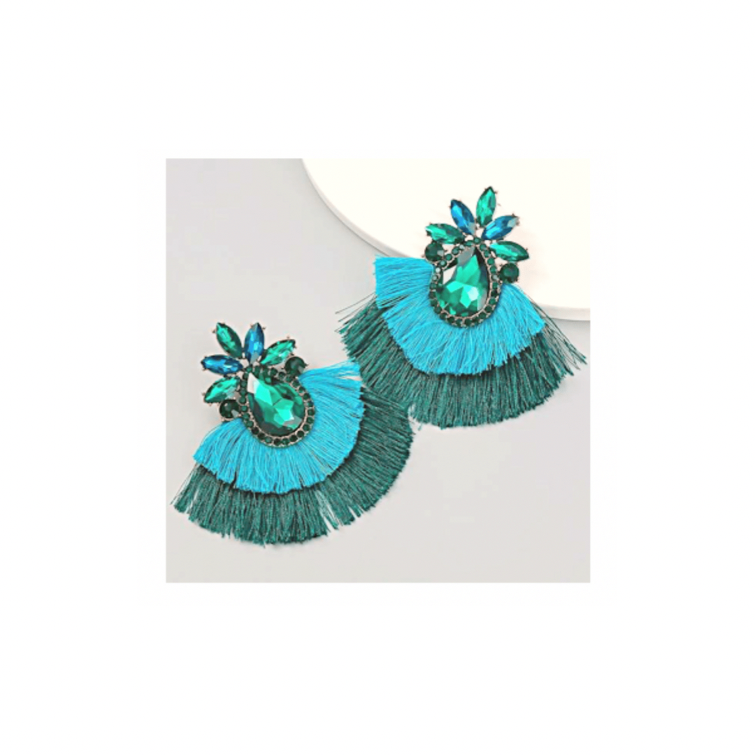 Large Green Fan Fringe And Gem Drop Earrings! These Big Blue Beauties Will Add A Trendy Touch Of Style To Your Outfit! Soft Fringe Detail And Fabulous Center Gem And Gem Post Details!