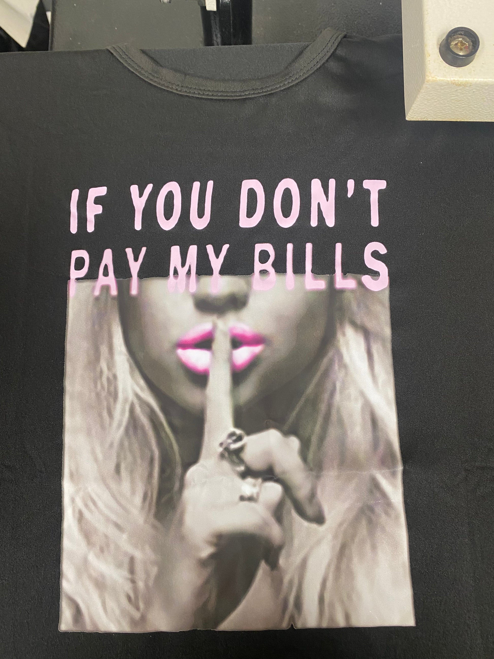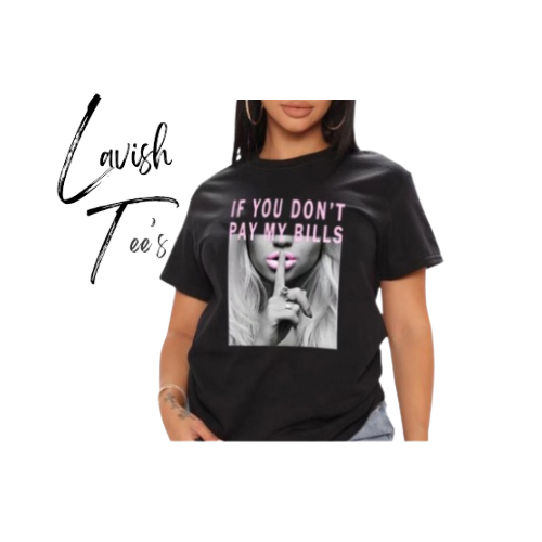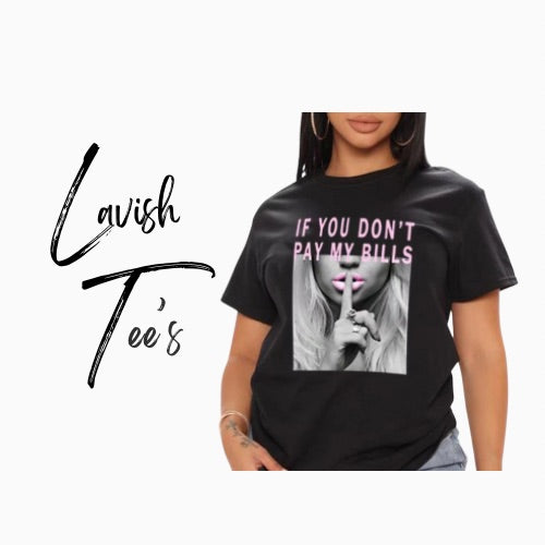 Sometimes You Just Have To Say It With A Shirt! This Black Graphic T-Shirt Has A Photo Transfer Image In Gray Scale With A Pink Quote “IF YOU DON’T PAY MY BILLS”. Easy To Wear! Pairs Nicely With Our Earrings From The LAVISHLOCKETT Earring Shop!!