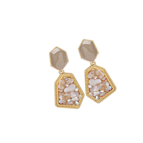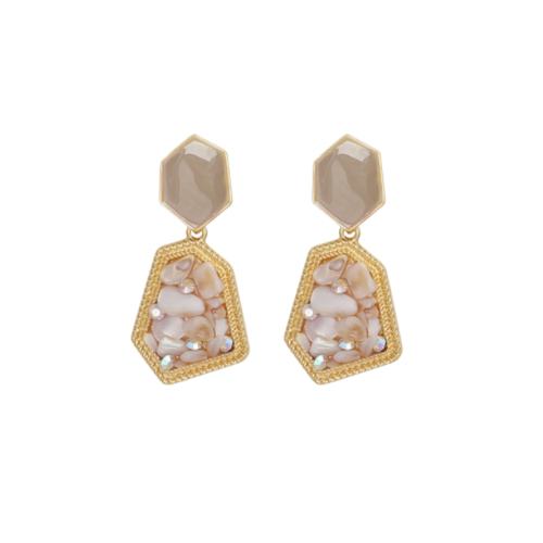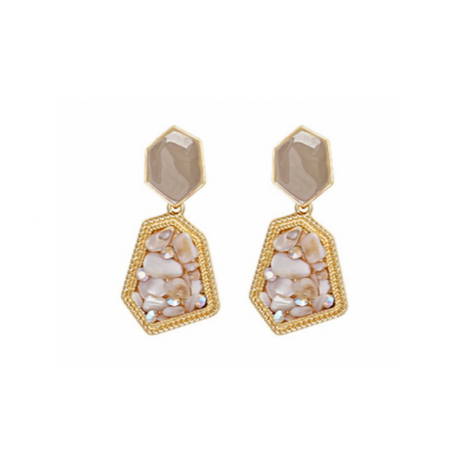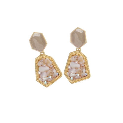 Trendy Geo Shaped Gold Dangle Earrings With Cool Stone Cluster Details And Neutral Colored Post. These Beauties Are Ready For Business And Play!